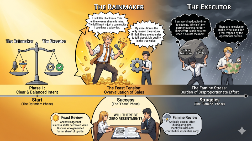 - A common flashpoint arises when the person primarily responsible for sales and marketing (the "rainmaker") begins to resent the partner focused on delivery and operations. The rainmaker may feel, especially during highly successful periods ("feast"), that they are the sole engine of the business's existence. Their internal logic may become: "I built this entire client base/revenue stream. The delivery/fulfillment is a replaceable commodity. I could simply pay someone a salary to do the work instead of sharing half the business with my partner." This mindset is corrosive and must be anticipated.