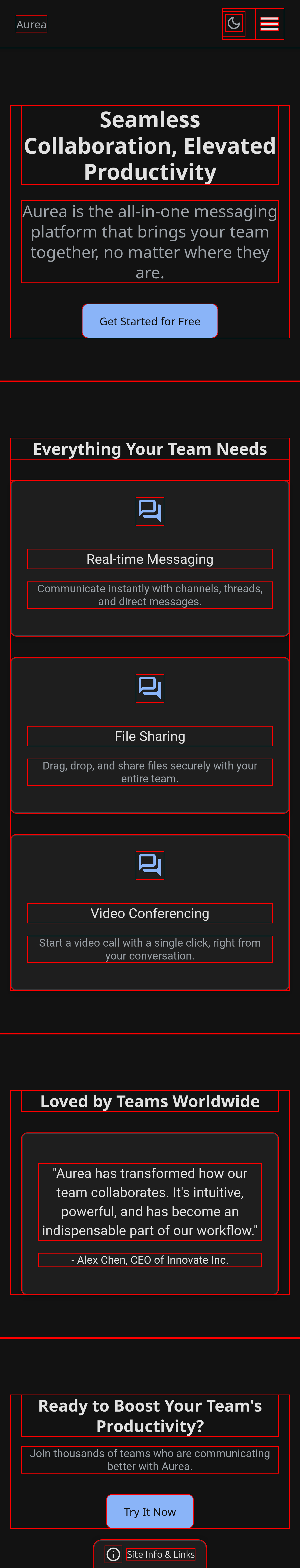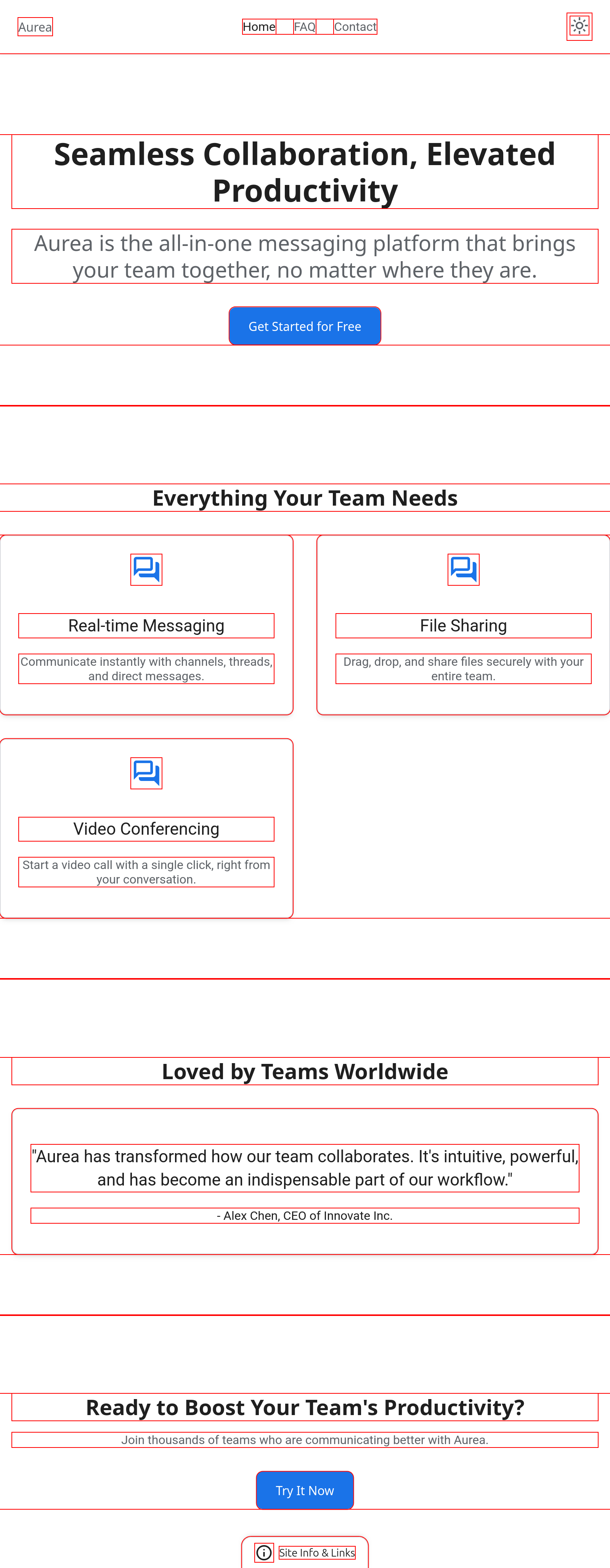 The screenshots shown include temporary layout boundaries used during validation. These markers are not part of the final implementation and were applied solely to inspect spacing, hierarchy, and component relationships during the design system’s development.